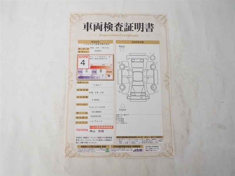 詳細及び現状の車両状態につきましては、店舗スタッフまでお尋ねください。 - 注2)上記と同様の評価点・状態表を「車両検査証明書」として店舗の展示車両に搭載しております。