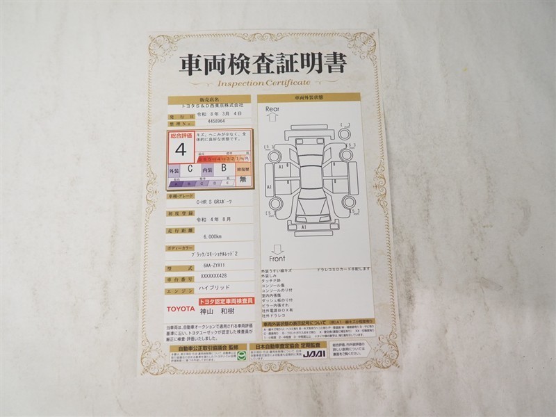 詳細及び現状の車両状態につきましては、店舗スタッフまでお尋ねください。 - 注2)上記と同様の評価点・状態表を「車両検査証明書」として店舗の展示車両に搭載しております。