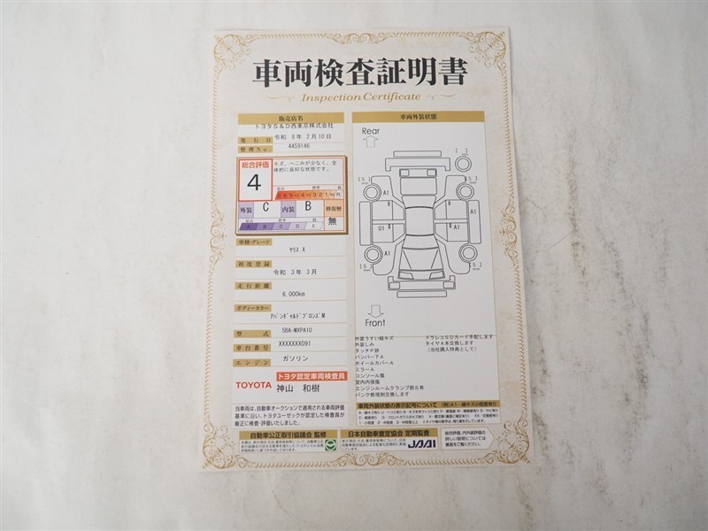 詳細及び現状の車両状態につきましては、店舗スタッフまでお尋ねください。 - 注2)上記と同様の評価点・状態表を「車両検査証明書」として店舗の展示車両に搭載しております。