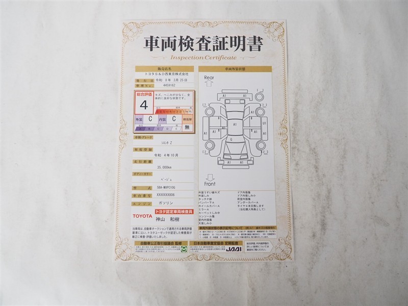 詳細及び現状の車両状態につきましては、店舗スタッフまでお尋ねください。 - 注2)上記と同様の評価点・状態表を「車両検査証明書」として店舗の展示車両に搭載しております。