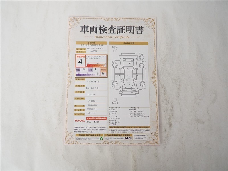 詳細及び現状の車両状態につきましては、店舗スタッフまでお尋ねください。 - 注2)上記と同様の評価点・状態表を「車両検査証明書」として店舗の展示車両に搭載しております。