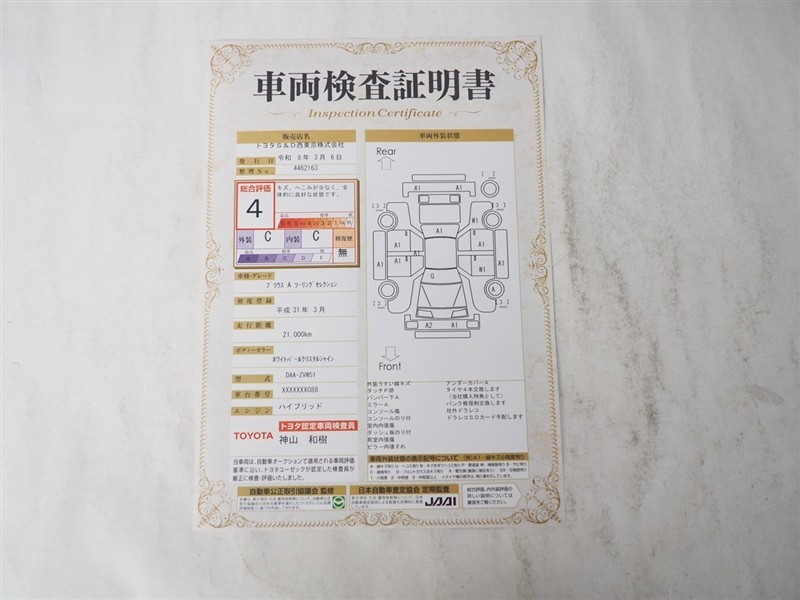詳細及び現状の車両状態につきましては、店舗スタッフまでお尋ねください。 - 注2)上記と同様の評価点・状態表を「車両検査証明書」として店舗の展示車両に搭載しております。