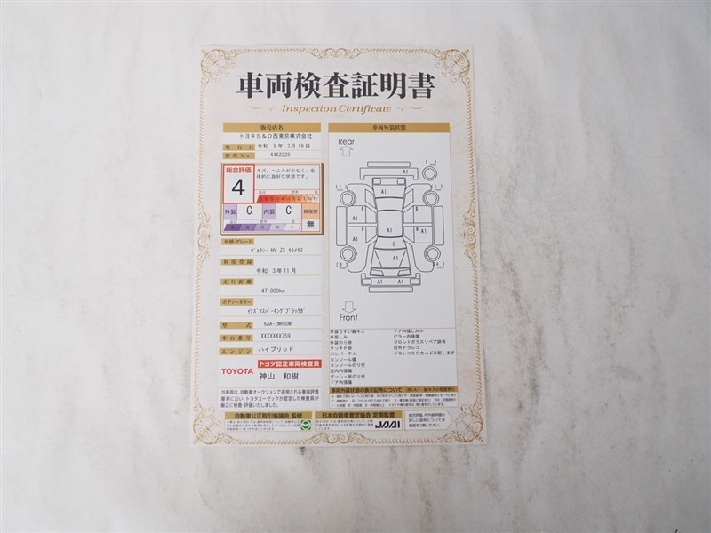詳細及び現状の車両状態につきましては、店舗スタッフまでお尋ねください。 - 注2)上記と同様の評価点・状態表を「車両検査証明書」として店舗の展示車両に搭載しております。