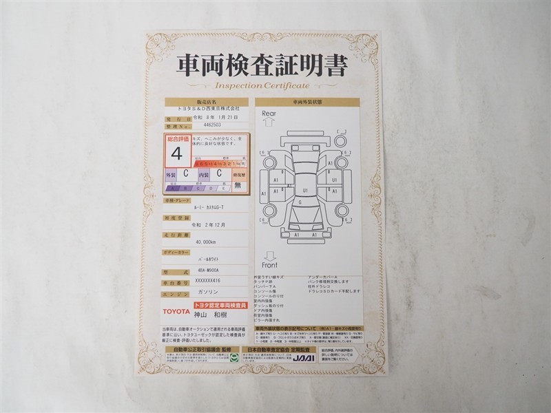 詳細及び現状の車両状態につきましては、店舗スタッフまでお尋ねください。 - 注2)上記と同様の評価点・状態表を「車両検査証明書」として店舗の展示車両に搭載しております。