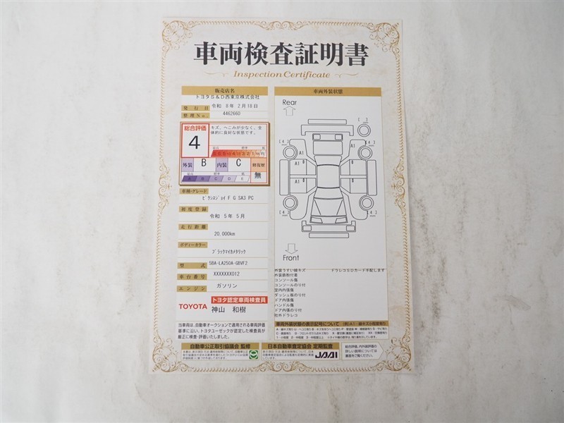 詳細及び現状の車両状態につきましては、店舗スタッフまでお尋ねください。 - 注2)上記と同様の評価点・状態表を「車両検査証明書」として店舗の展示車両に搭載しております。