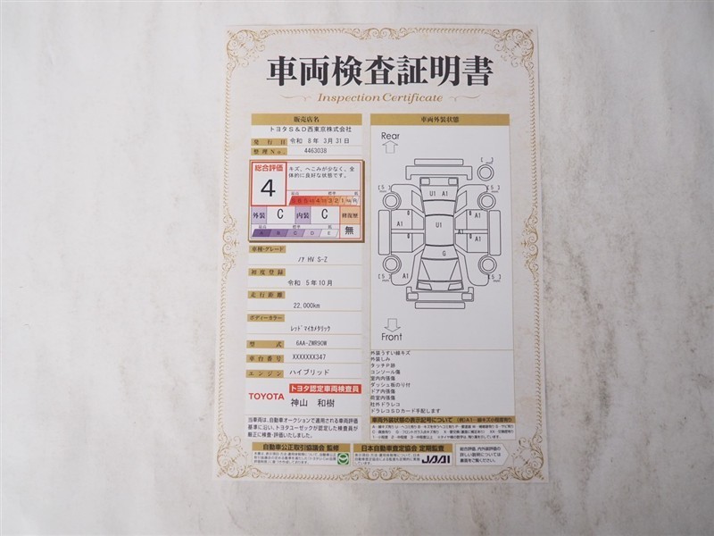 詳細及び現状の車両状態につきましては、店舗スタッフまでお尋ねください。 - 注2)上記と同様の評価点・状態表を「車両検査証明書」として店舗の展示車両に搭載しております。