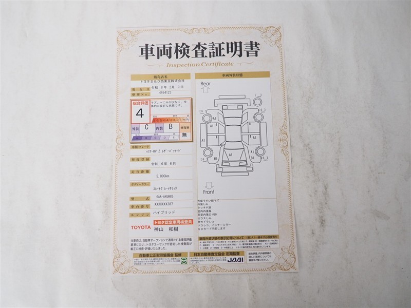 上記と同様の評価点・状態表を「車両検査証明書」として店舗の展示車両に搭載しております。