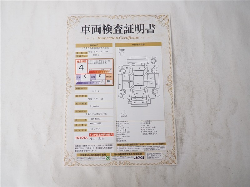 詳細及び現状の車両状態につきましては、店舗スタッフまでお尋ねください。 - 注2)上記と同様の評価点・状態表を「車両検査証明書」として店舗の展示車両に搭載しております。