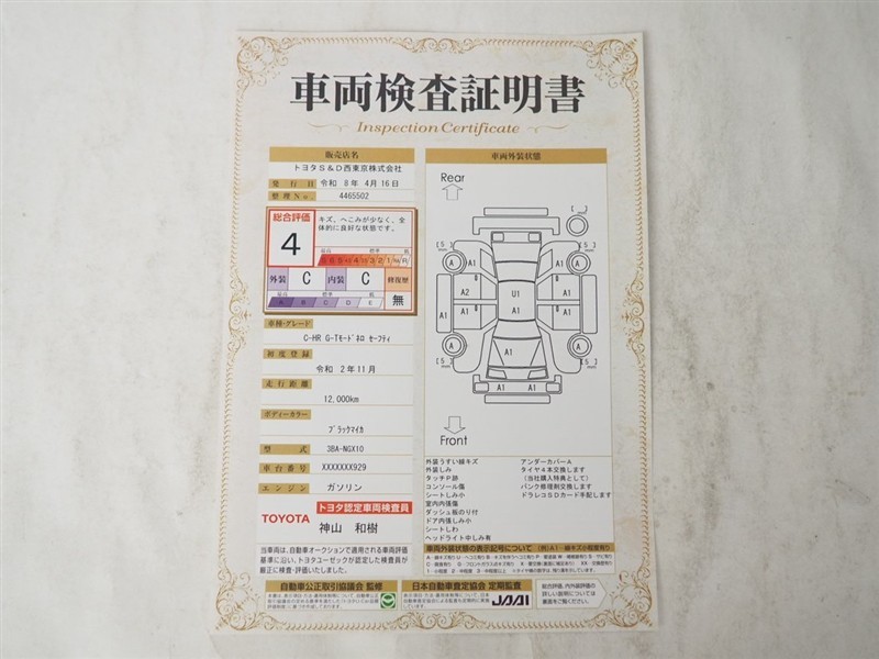 上記と同様の評価点・状態表を「車両検査証明書」として店舗の展示車両に搭載しております。