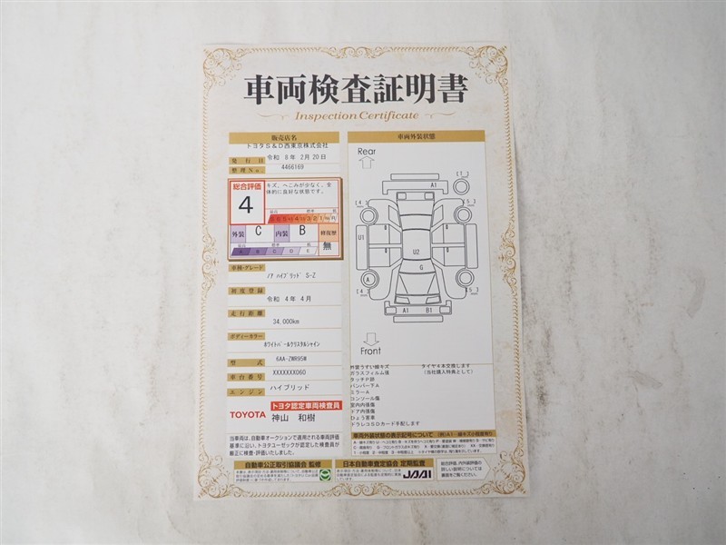 詳細及び現状の車両状態につきましては、店舗スタッフまでお尋ねください。 - 注2)上記と同様の評価点・状態表を「車両検査証明書」として店舗の展示車両に搭載しております。