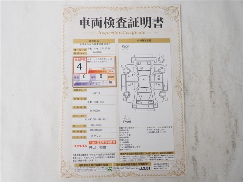 詳細及び現状の車両状態につきましては、店舗スタッフまでお尋ねください。 - 注2)上記と同様の評価点・状態表を「車両検査証明書」として店舗の展示車両に搭載しております。