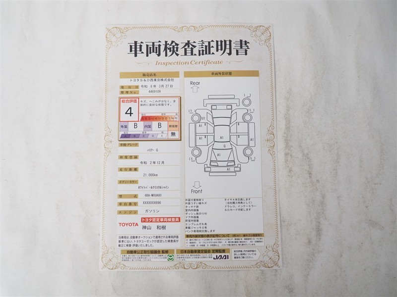 詳細及び現状の車両状態につきましては、店舗スタッフまでお尋ねください。 - 注2)上記と同様の評価点・状態表を「車両検査証明書」として店舗の展示車両に搭載しております。