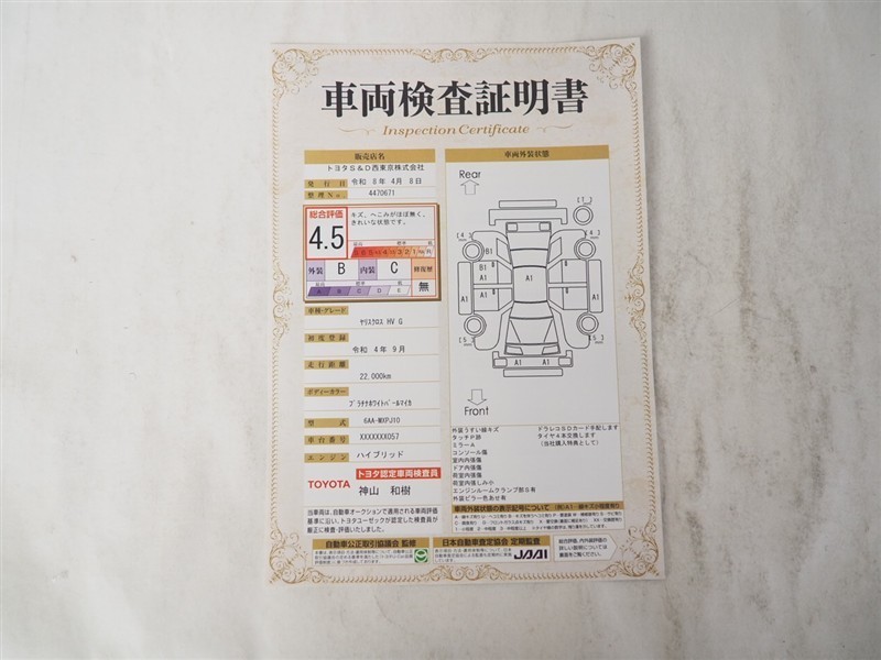 - 表示項目・方法・運用体制等について、自動車公正取引協議会の定める基準を満たした「トヨタU-Car品質評価制度」に基づき作成しております。
