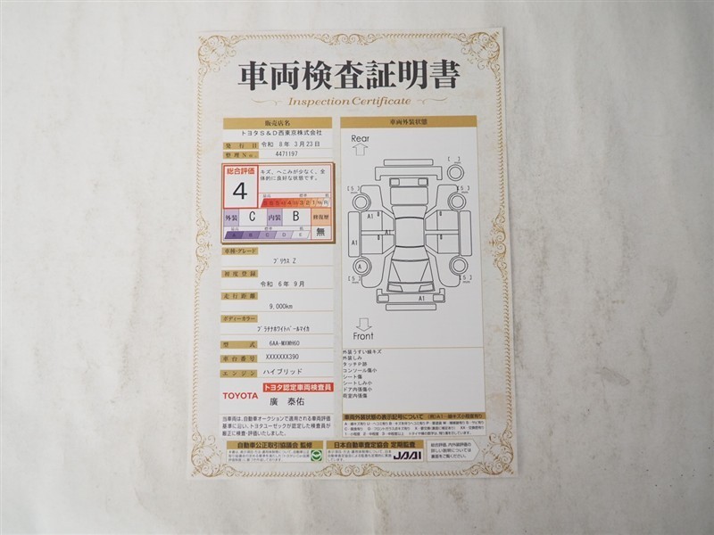 詳細及び現状の車両状態につきましては、店舗スタッフまでお尋ねください。 - 注2)上記と同様の評価点・状態表を「車両検査証明書」として店舗の展示車両に搭載しております。