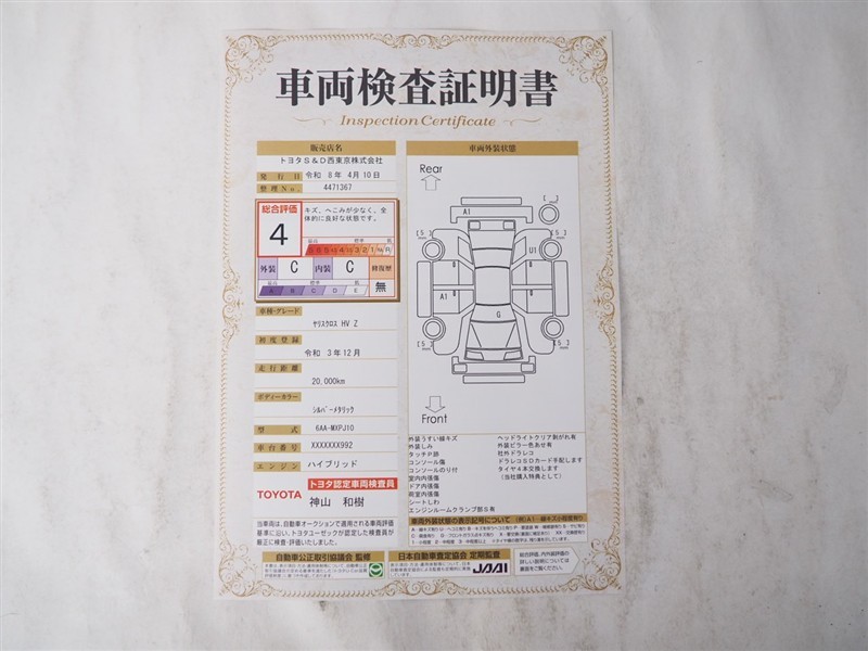 詳細及び現状の車両状態につきましては、店舗スタッフまでお尋ねください。 - 注2)上記と同様の評価点・状態表を「車両検査証明書」として店舗の展示車両に搭載しております。