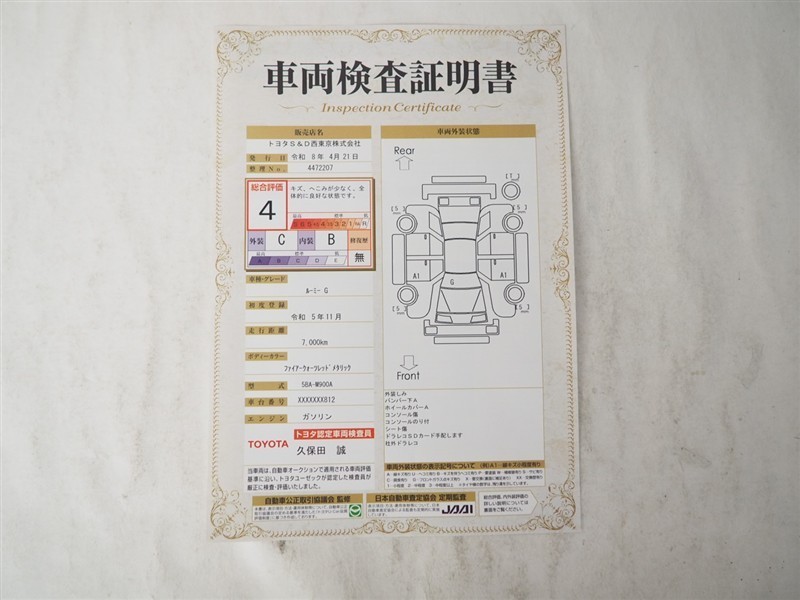上記と同様の評価点・状態表を「車両検査証明書」として店舗の展示車両に搭載しております。