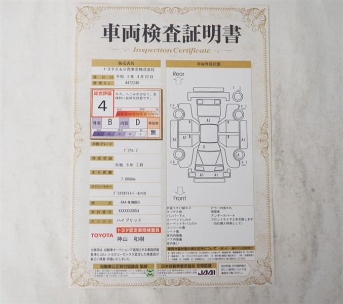 上記と同様の評価点・状態表を「車両検査証明書」として店舗の展示車両に搭載しております。