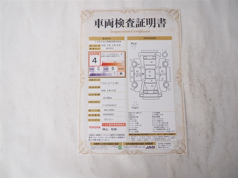 上記と同様の評価点・状態表を「車両検査証明書」として店舗の展示車両に搭載しております。