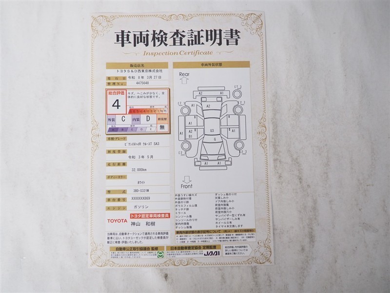 詳細及び現状の車両状態につきましては、店舗スタッフまでお尋ねください。 - 注2)上記と同様の評価点・状態表を「車両検査証明書」として店舗の展示車両に搭載しております。