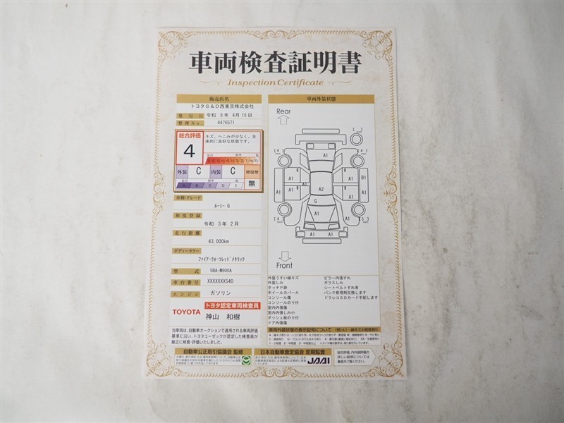 上記と同様の評価点・状態表を「車両検査証明書」として店舗の展示車両に搭載しております。