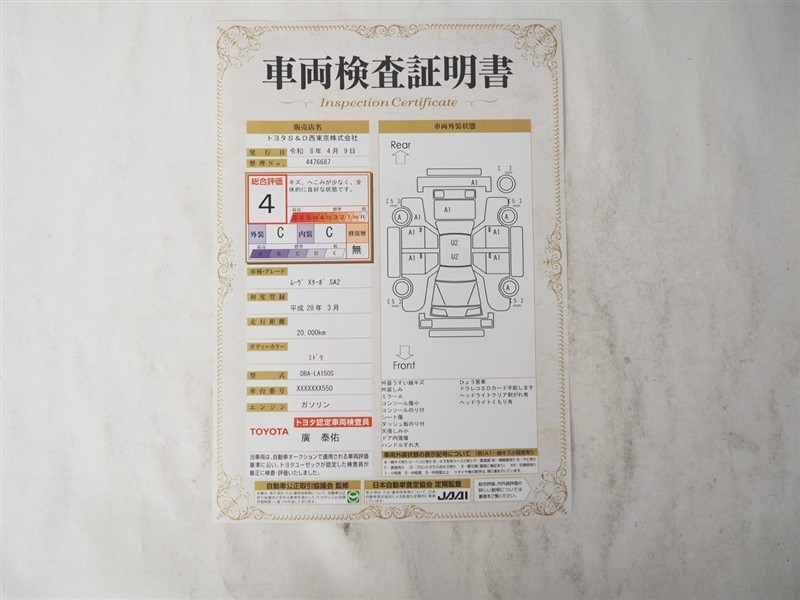 詳細及び現状の車両状態につきましては、店舗スタッフまでお尋ねください。 - 注2)上記と同様の評価点・状態表を「車両検査証明書」として店舗の展示車両に搭載しております。