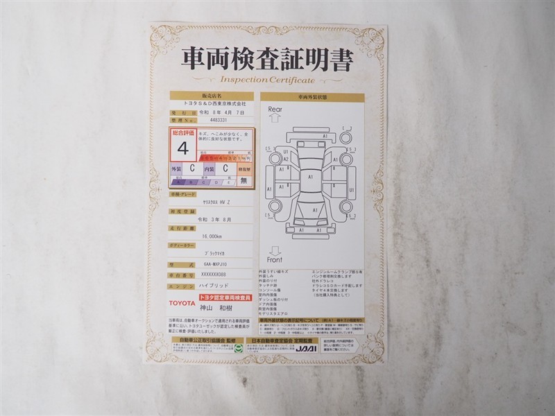 詳細及び現状の車両状態につきましては、店舗スタッフまでお尋ねください。 - 注2)上記と同様の評価点・状態表を「車両検査証明書」として店舗の展示車両に搭載しております。