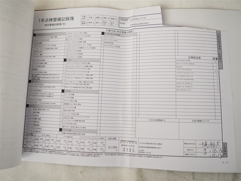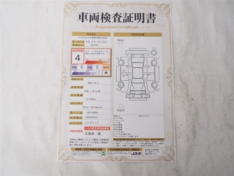 上記と同様の評価点・状態表を「車両検査証明書」として店舗の展示車両に搭載しております。