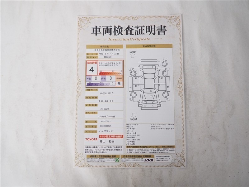 上記と同様の評価点・状態表を「車両検査証明書」として店舗の展示車両に搭載しております。