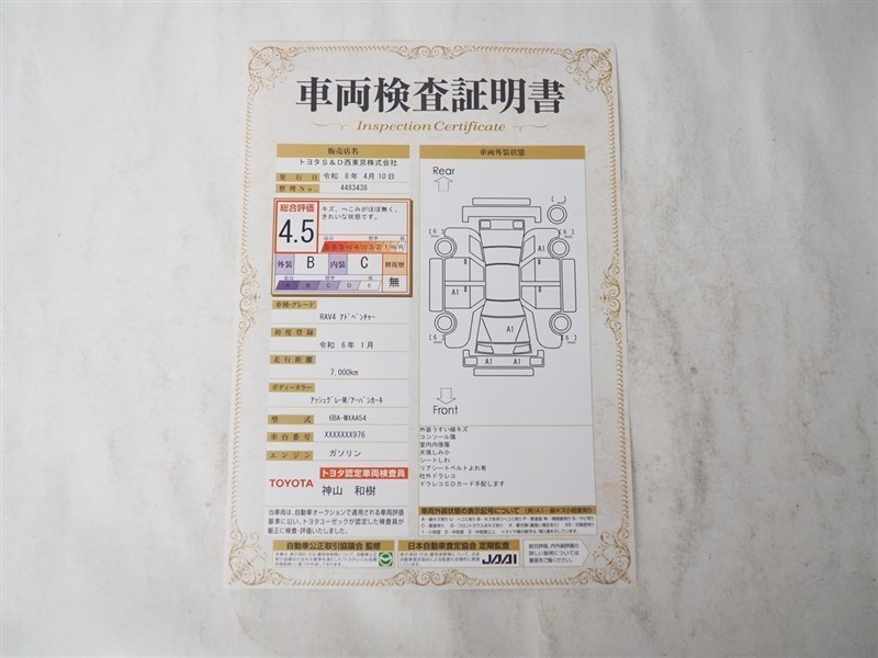 詳細及び現状の車両状態につきましては、店舗スタッフまでお尋ねください。 - 注2)上記と同様の評価点・状態表を「車両検査証明書」として店舗の展示車両に搭載しております。