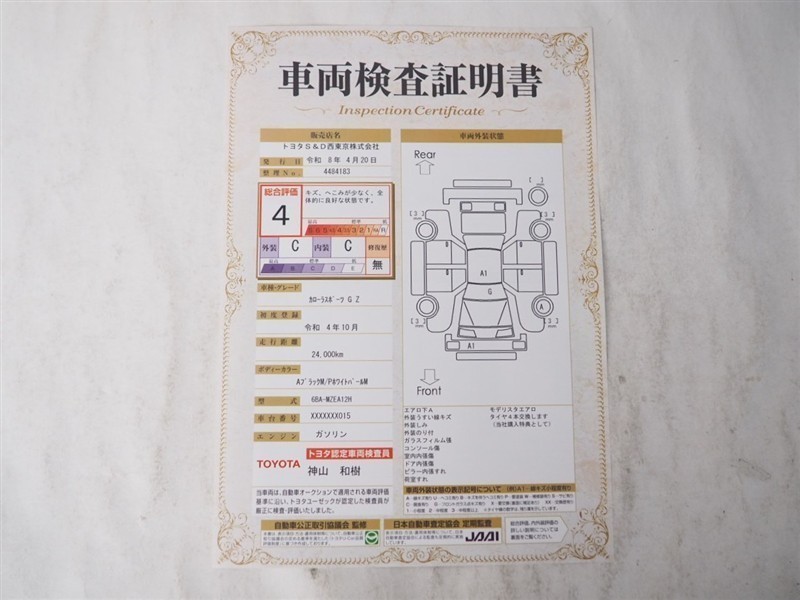 上記と同様の評価点・状態表を「車両検査証明書」として店舗の展示車両に搭載しております。