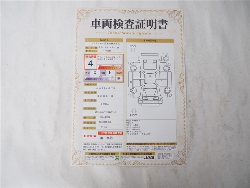 上記と同様の評価点・状態表を「車両検査証明書」として店舗の展示車両に搭載しております。