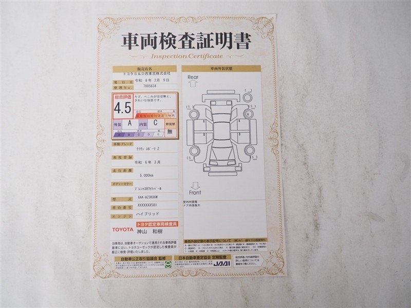 詳細及び現状の車両状態につきましては、店舗スタッフまでお尋ねください。 - 注2)上記と同様の評価点・状態表を「車両検査証明書」として店舗の展示車両に搭載しております。