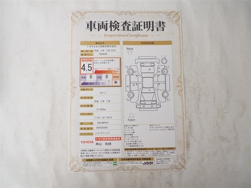 詳細及び現状の車両状態につきましては、店舗スタッフまでお尋ねください。 - 注2)上記と同様の評価点・状態表を「車両検査証明書」として店舗の展示車両に搭載しております。