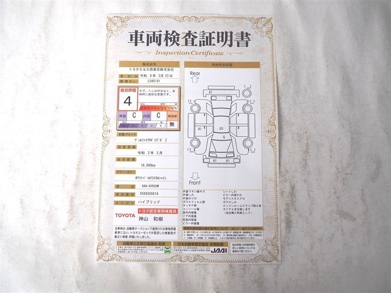 詳細及び現状の車両状態につきましては、店舗スタッフまでお尋ねください。 - 注2)上記と同様の評価点・状態表を「車両検査証明書」として店舗の展示車両に搭載しております。