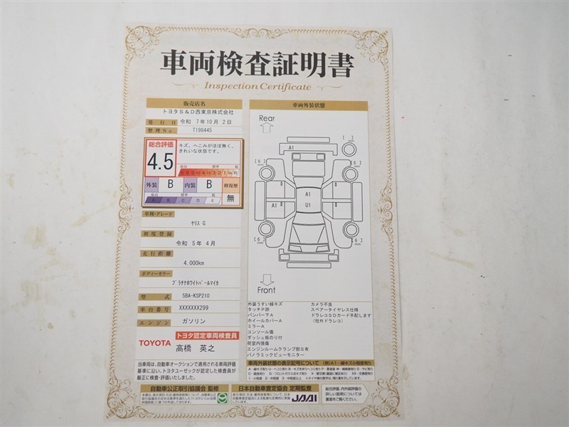 - 表示項目・方法・運用体制等について、自動車公正取引協議会の定める基準を満たした「トヨタU-Car品質評価制度」に基づき作成しております。
