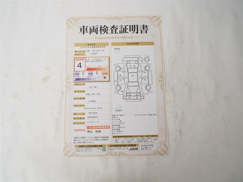 詳細及び現状の車両状態につきましては、店舗スタッフまでお尋ねください。 - 注2)上記と同様の評価点・状態表を「車両検査証明書」として店舗の展示車両に搭載しております。