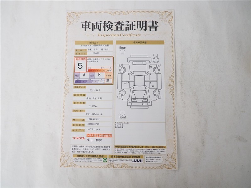 詳細及び現状の車両状態につきましては、店舗スタッフまでお尋ねください。 - 注2)上記と同様の評価点・状態表を「車両検査証明書」として店舗の展示車両に搭載しております。