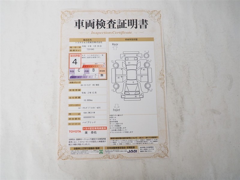 詳細及び現状の車両状態につきましては、店舗スタッフまでお尋ねください。 - 注2)上記と同様の評価点・状態表を「車両検査証明書」として店舗の展示車両に搭載しております。