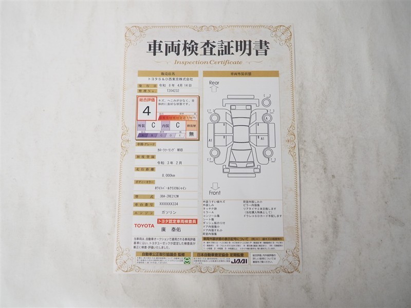 上記と同様の評価点・状態表を「車両検査証明書」として店舗の展示車両に搭載しております。