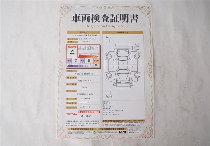 上記と同様の評価点・状態表を「車両検査証明書」として店舗の展示車両に搭載しております。