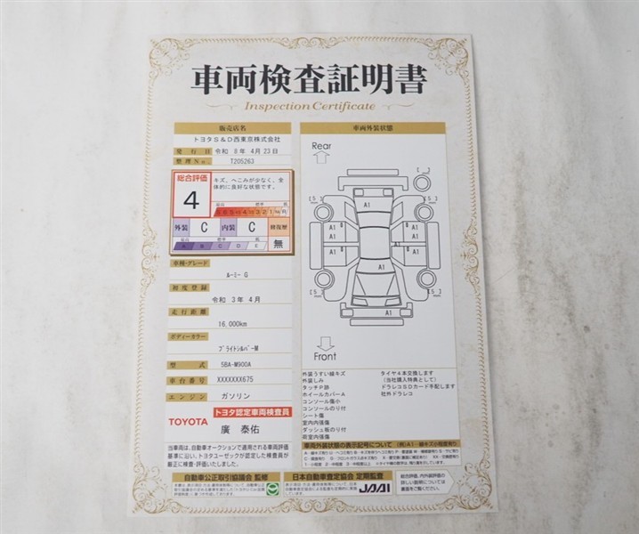 上記と同様の評価点・状態表を「車両検査証明書」として店舗の展示車両に搭載しております。