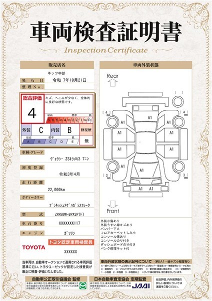 詳細及び現状の車両状態につきましては、店舗スタッフまでお尋ねください。 - 注2)上記と同様の評価点・状態表を「車両検査証明書」として店舗の展示車両に搭載しております。