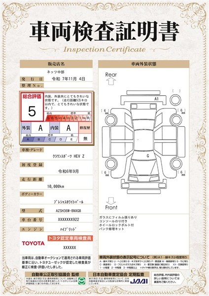 詳細及び現状の車両状態につきましては、店舗スタッフまでお尋ねください。 - 注2)上記と同様の評価点・状態表を「車両検査証明書」として店舗の展示車両に搭載しております。