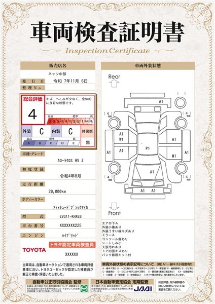 詳細及び現状の車両状態につきましては、店舗スタッフまでお尋ねください。 - 注2)上記と同様の評価点・状態表を「車両検査証明書」として店舗の展示車両に搭載しております。