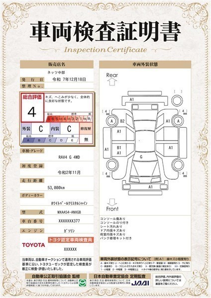 上記と同様の評価点・状態表を「車両検査証明書」として店舗の展示車両に搭載しております。