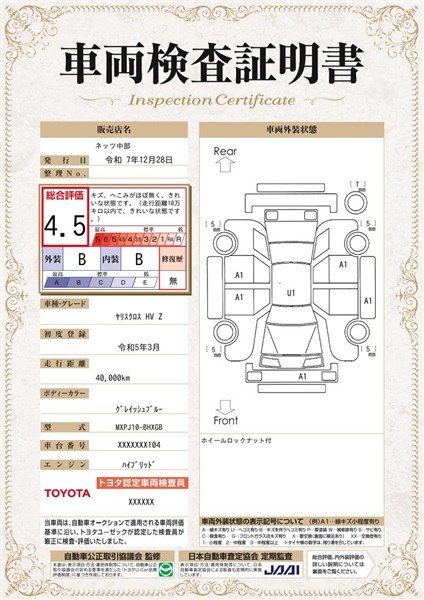 詳細及び現状の車両状態につきましては、店舗スタッフまでお尋ねください。 - 注2)上記と同様の評価点・状態表を「車両検査証明書」として店舗の展示車両に搭載しております。