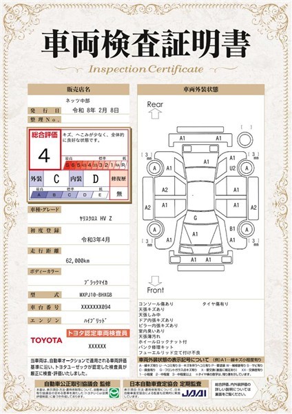 詳細及び現状の車両状態につきましては、店舗スタッフまでお尋ねください。 - 注2)上記と同様の評価点・状態表を「車両検査証明書」として店舗の展示車両に搭載しております。