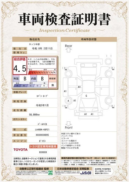 詳細及び現状の車両状態につきましては、店舗スタッフまでお尋ねください。 - 注2)上記と同様の評価点・状態表を「車両検査証明書」として店舗の展示車両に搭載しております。