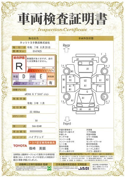 詳細及び現状の車両状態につきましては、店舗スタッフまでお尋ねください。 - 注2)上記と同様の評価点・状態表を「車両検査証明書」として店舗の展示車両に搭載しております。