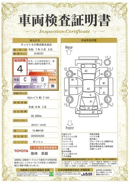 詳細及び現状の車両状態につきましては、店舗スタッフまでお尋ねください。 - 注2)上記と同様の評価点・状態表を「車両検査証明書」として店舗の展示車両に搭載しております。